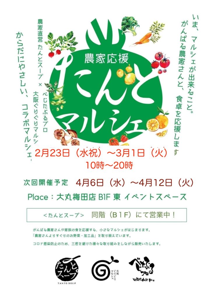 2月23日〜3月1 たんとマルシェ@梅田大丸地下一階 2022.02.22未分類 Post Share RSS Pin it 2月23日(水)より3月1日(火)まで、梅田大丸地下一階にて、恒例のたんとマルシェをおこないます★ べじたぶるプロさんのお野菜や山辺さんの果物、グルテンフリー食品などなど ぜひどうぞ^^ Post Share 投稿者: soraniwa未分類コメント: 0